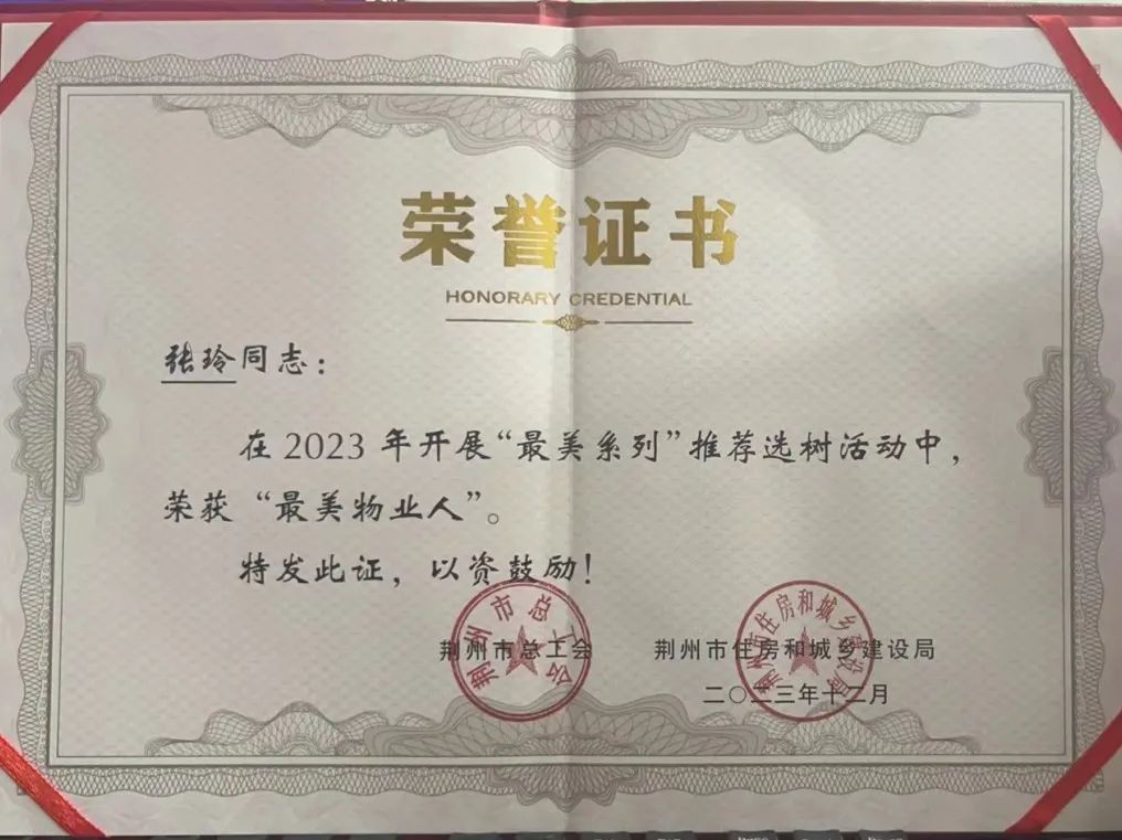 同時,在2023年的“最美系列”推薦選樹活動中,荊州市評選出了10位物業人員獲得“最美物業人”榮譽稱號。湖北福晟物業有限公司高級主管張玲玲由于在黨建引領的紅色物業服務企業中取得了出色成績,成為監利市首位獲得“最美物業人”個人榮譽稱號的優秀人才。